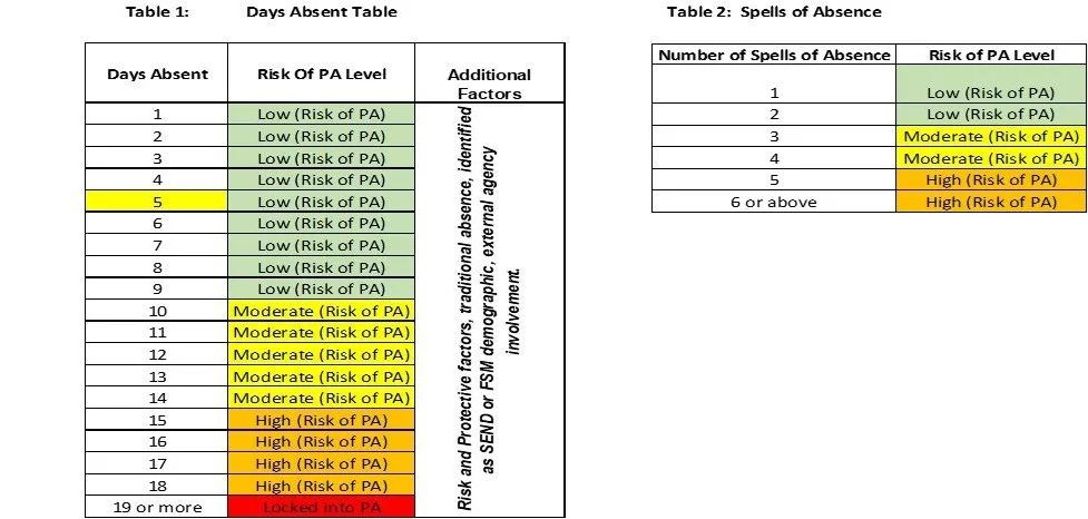 Our approach: We monitor attendance closely and engage with parents early to offer advice and assistance. See tables 1 and 2 which is how we identify pupils who may be Risk of PA.